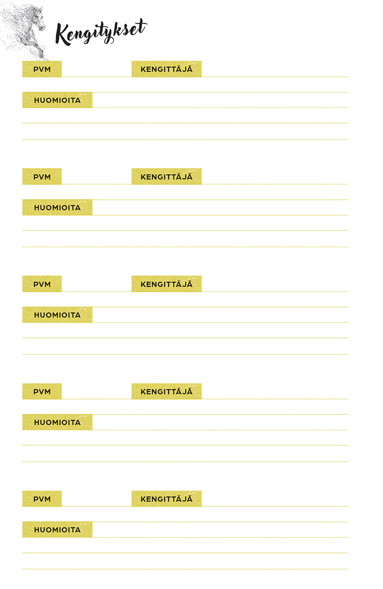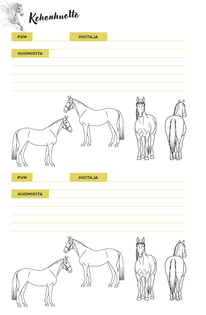 Kalenteriin voit merkitä esimerkiksi: ✔ ruokinnan ja lisäravinteet ✔ treenit, palautumisen ja kisapäivät ✔ hoidon ja varustehuollot ✔ eläinlääkärikäynnit ✔ kengitykset
